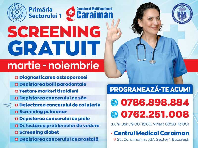 Locuitorii din Sectorul 1 vor beneficia și în acest an de screening gratuit la Complexul Medical Caraiman, în cadrul campaniei 'Fă-ți timp pentru sănătate. Testează-te!'. Campania a demarat luni și se va desfășura până la începutul lunii decembrie, la Complexul Medical Caraiman. ''Pentru ediția din acest a