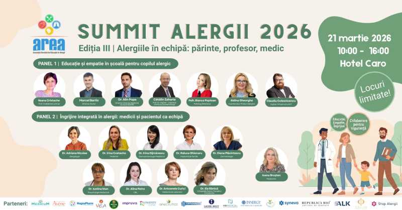 Asociația Română de Educație în Alergii (AREA) va organiza sâmbătă Summitul Alergii 2026, un eveniment care aduce împreună specialiști din educație, psihologie și medicină pentru a discuta modul în care pot colabora părinții, profesorii și medicii în gestionarea alergiilor la copii. 'Alergiile nu afectează doar sănătatea