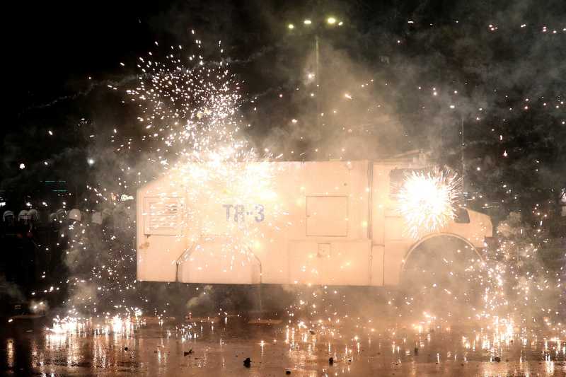 După discursul acestuia, un grup restrâns de câteva zeci de protestatari au aruncat artificii și cocktailuri Molotov către polițiști.