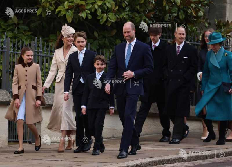 Sub razele unui soare primăvăratic, regele Charles al III-lea, în vârstă de 77 de ani, și regina Camilla, însoțiți de prințul moștenitor William, de soția sa Kate și de copiii acestora - George, Charlotte și Louis - s-au deplasat împreună la capela St. George de pe domeniul Castelului Windsor pentru a asista la slujba de Paște.