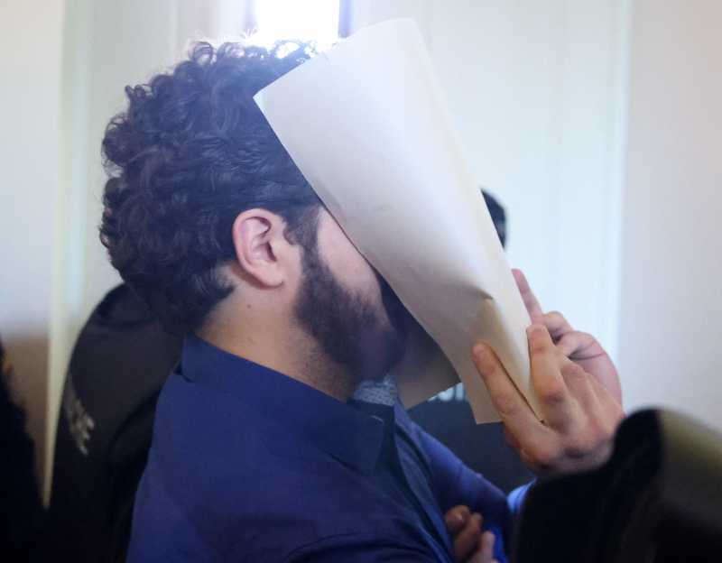 Ambii inculpați și-au acoperit fețele la intrarea în sala de judecată.