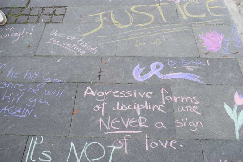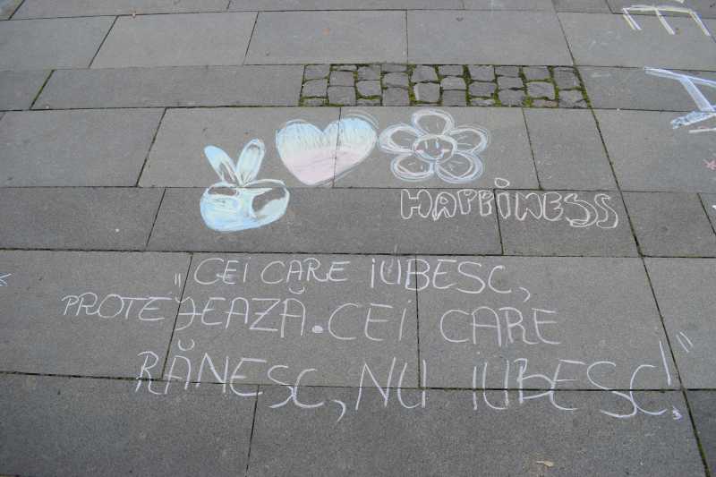 La eveniment au participat și zeci de elevi de liceu care au scris pe pavaj mesaje împotriva violenței domestice în limbile română, maghiară și engleză