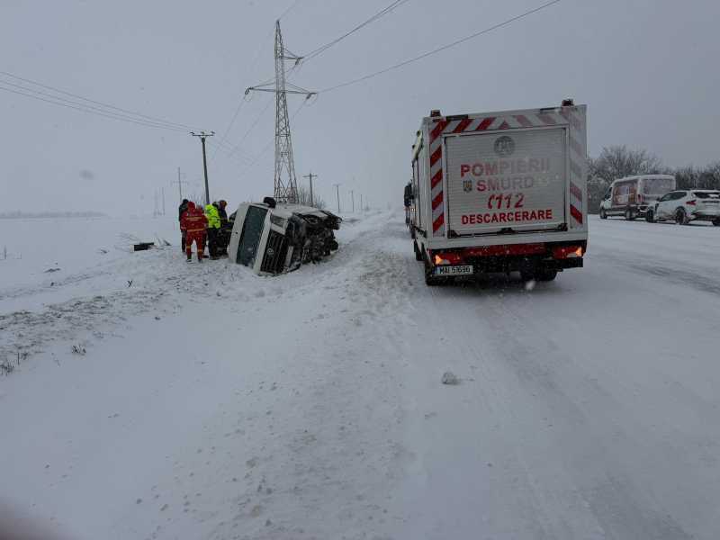 O femeie de 55 de ani, din județul Ilfov, a fost transportată la spital după ce un microbuz în care se aflau 16 persoane s-a răsturnat pe DN 5, în dreptul localității Plopșoru.