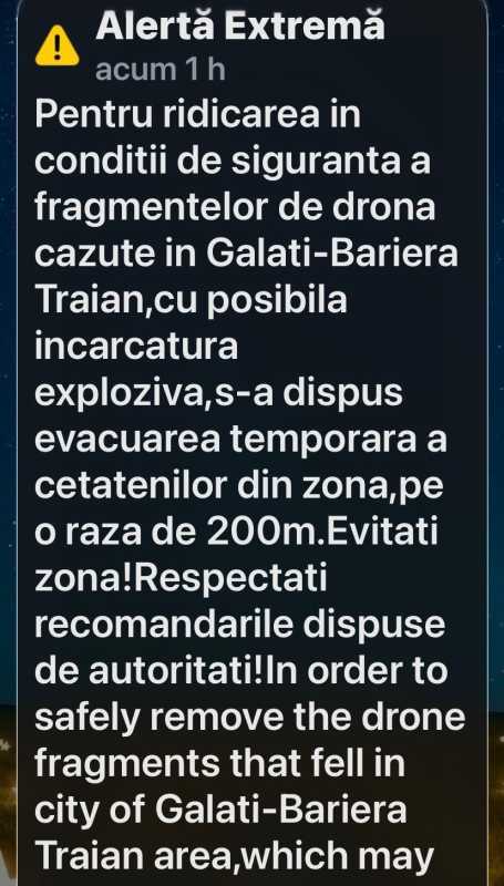 Autoritățile au transmis însă un mesaj RO-ALERT la câteva minute după ora 10,00, cu privire la desfășurarea acțiunii de evacuare în zona barierei Traian, fiindu-le recomandat cetățenilor să evite zona în care a căzut drona.