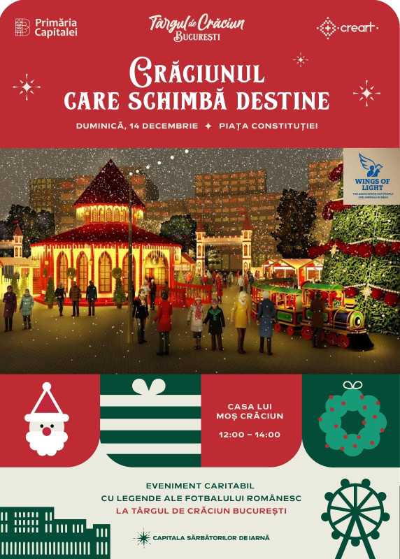 ''Târgul de Crăciun din Piața Constituției, organizat de Primăria Municipiului București prin CREART, găzduiește, duminică, în intervalul 12:00 - 14:00, în Casa lui Moș Crăciun, evenimentul caritabil ''Crăciunul care schimbă destine'', la care vor participa legende ale fotbalului românesc. Potriv