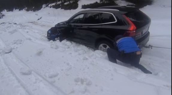 VIDEO Alba: Jandarmii au ajutat un cuplu care a rămas cu mașina în zăpadă, pe un tronson al DN 67C închis circulației
