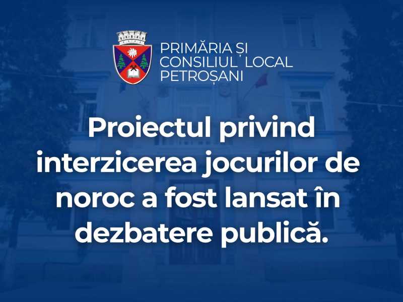 Primăria Petroșani a lansat, joi, în dezbatere publică un proiect de hotărâre prin care propune interzicerea jocurilor de noroc pe raza municipiului, forma finală a documentului urmând să fie supusă aprobării Consiliului Local. În principal, proiectul de hotărâre prevede ca operatorii care dețin săli de jocuri de