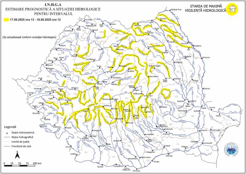 Institutul Național de Hidrologie și Gospodărire a Apelor (INHGA) a emis, vineri, o atenționare Cod galben de inundații, valabilă până sâmbătă dimineața în 12 bazine hidrografice. Astfel, în intervalul 22 august, ora 12:00 - 23 augu