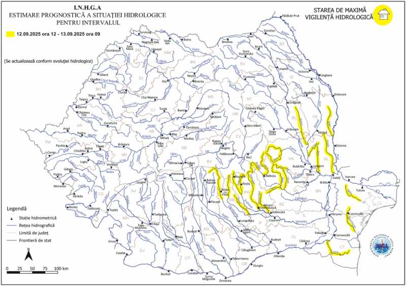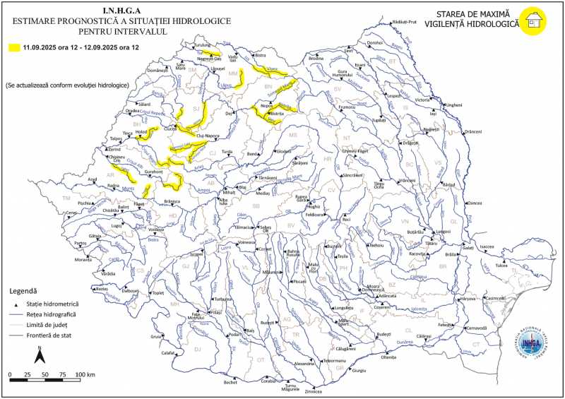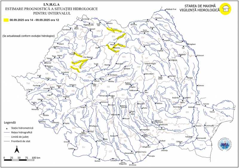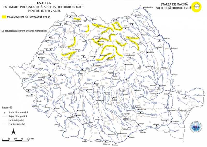 Institutul Național de Hidrologie și Gospodărire a Apelor (INHGA) a emis luni o atenționare Cod galben de inundații pe anumite sectoare de râuri din județele Maramureș, Bistrița-Năsăud, Cluj, Bihor și Alba, care va intra în vigoare la o