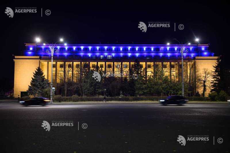 UCRAINA - 4 ANI DE RĂZBOI/ Palatul Victoria - iluminat marți seara în culorile drapelului ucrainean