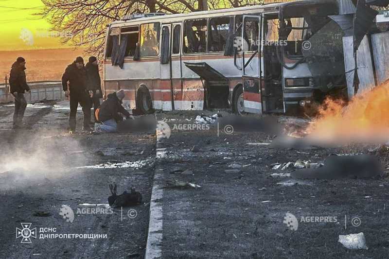 Un atac cu dronă rusească asupra unui autobuz care transporta angajați ai unei mine din regiunea ucraineană Dnipropetrovsk (centru-est) s-a soldat cu cel puțin 12 răniți și șapte răniți duminică, au anunțat serviciile de urgență și a