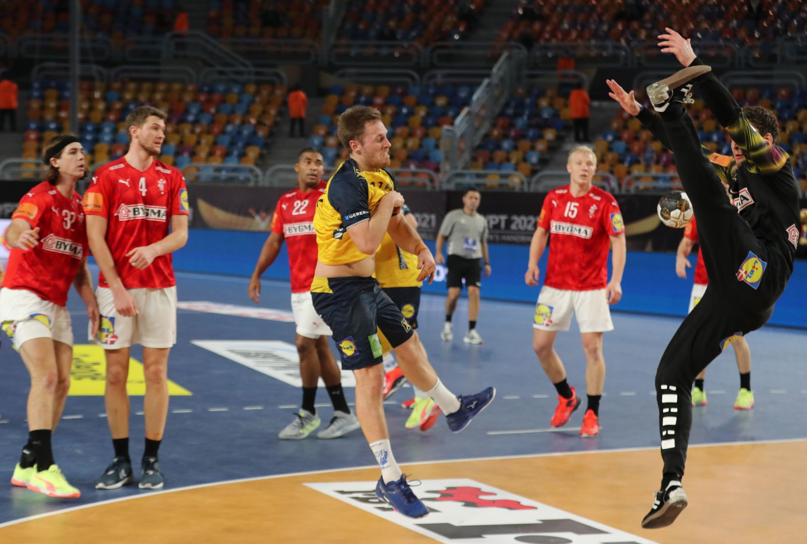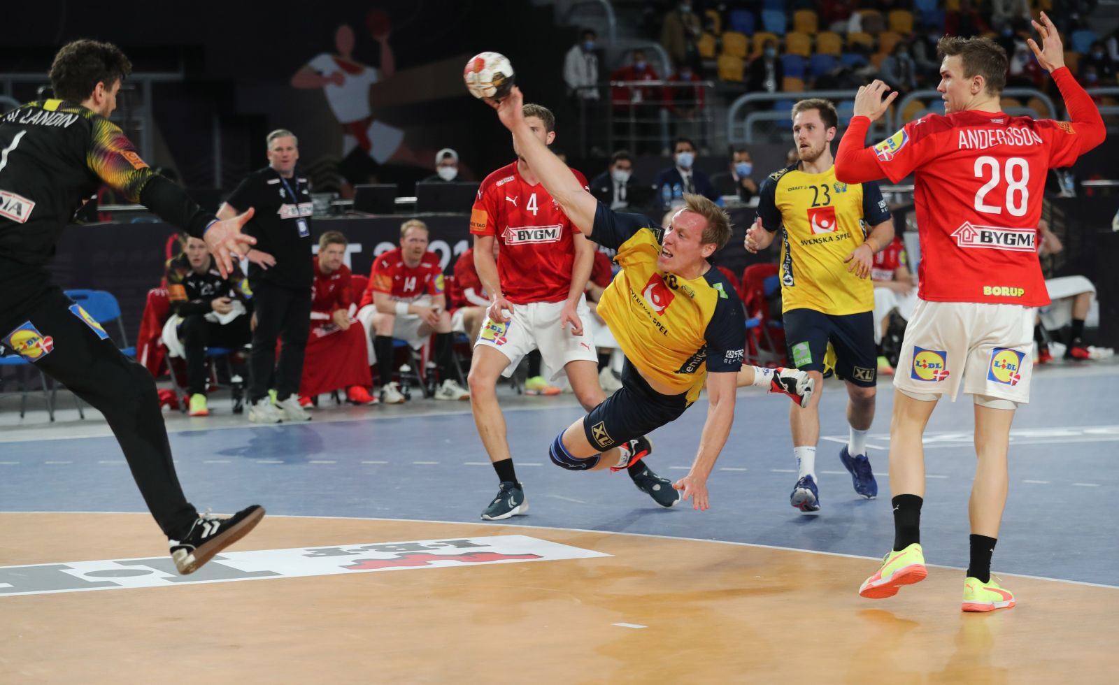 Suedezii au venit în Egipt fără o serie de jucători de top, precum Niclas Ekberg, Jesper Nielsen, Andreas Nilsson, Lukas Nilsson, cu o generaţie fără referinţă la nivel internaţional, dar au făcut un meci bun şi au condus în prima repriză cu 12-10, iar în partea secundă cu 18-17. Campionii olimpici şi-au justificat însă statutul, în frunte cu Niklas Landin, cel mai bun portar al lumii. Danezii s-au desprins pe final la 25-22 şi au obţinut victoria.