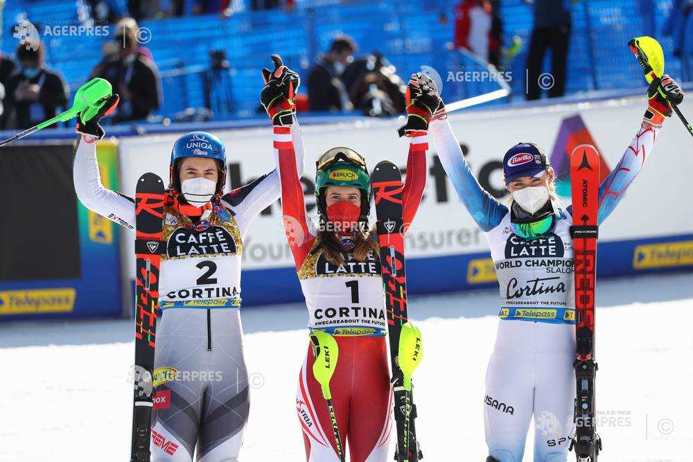 Katharina Liensberger din Austria a cucerit medalia de aur în proba de slalom feminin din cadrul Campionatelor Mondiale de schi alpin, ediţia 2021, desfăşurată sâmbătă în staţiunea italiană Cortina d'Ampezzo.