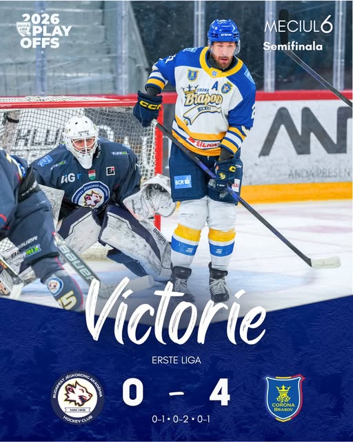 Corona Brașov a egalat situația semifinala Erste Liga la hochei pe gheață cu Budapest Jegkorong Akademia HC, după ce s-a impus cu scorul de 4-0 (1-0, 2-0, 1-0), vineri seara, în deplasare. Corona s-a impus prin golurile marcate de Jared Michael Van Wormer, Radim Valchar și Balazs Gajdo (2). Scorul general al semifinalei es