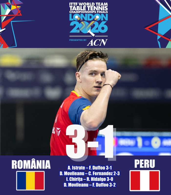 Selecționata masculină de tenis de masă a României s-a calificat pe tabloul principal la Campionatele Mondiale pe echipe de la Londra, după ce a câștigat Grupa a 9-a din faza 1B. Joi, Andrei Istrate l-a învins pe Felipe Duffoo cu scorul de 3-1 (11-4, 9-11, 11-7, 11-8), dar apoi Darius Movileanu a fost întrecut de Darius