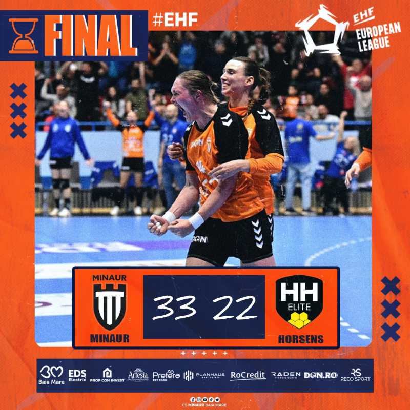 CS Minaur Baia Mare s-a calificat în grupele competiției de handbal feminin EHF European League, după ce a învins echipa daneză HH Elite, cu scorul de 33-22 (19-12), duminică seara, în Sala Polivalentă ''Lascăr Pană'', în manșa secundă a turului al treilea preliminar. Minaur fusese învinsă în prima manșă, la