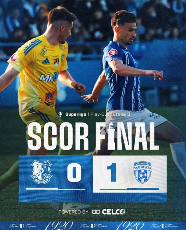 Farul Constanța a fost învinsă de Unirea Slobozia cu scorul de 1-0 (0-0), duminică, pe teren propriu, la Ovidiu, într-un meci din etapa a treia a fazei play-out a Superligii de fotbal. Unicul gol al partidei a fost reușit de peruanul Renato Espinosa (54).