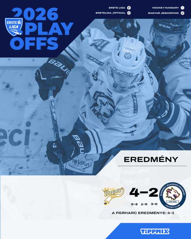 Corona Brașov s-a calificat în finala Erste Liga la hochei pe gheață, după ce a învins-o pe Budapest Jegkorong Akademia HC, cu scorul de 4-2 (0-2, 1-0, 3-0), duminică, pe Patinoarul Olimpic din Brașov, în ultimul meci al semifinalei. Oaspeții aveau 2-0 după prima repriză, grație golurilor marcate de Gergo Daniel Nagy (07:24)