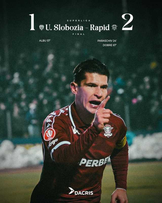 Rapid București a învins-o pe Unirea Slobozia cu scorul de 2-1 (1-0), luni seara, în deplasare, în ultimul meci din etapa a 29-a a Superligii de fotbal. Rapid a deschis scorul prin Daniel Paraschiv (24), cu o lovitură de cap, la centrarea lui Olimpiu Moruțan. Unirea a egalat după pauză, prin fostul rapidist Alexandru Albu (57