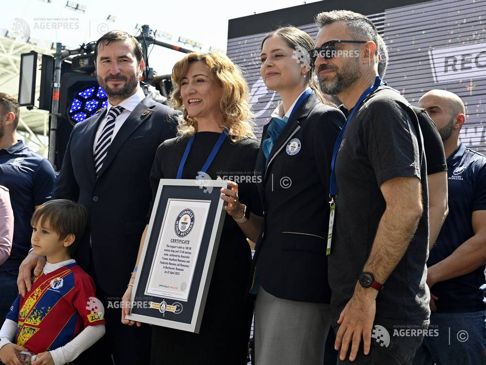 Cel mai mare tricou din lume, o replică a echipamentului echipei naţionale de rugby a României, a fost expus, sâmbătă, pe stadionul Arcul de Triumf din Bucureşti, articolul fiind omologat şi de Cartea Recordurilor.