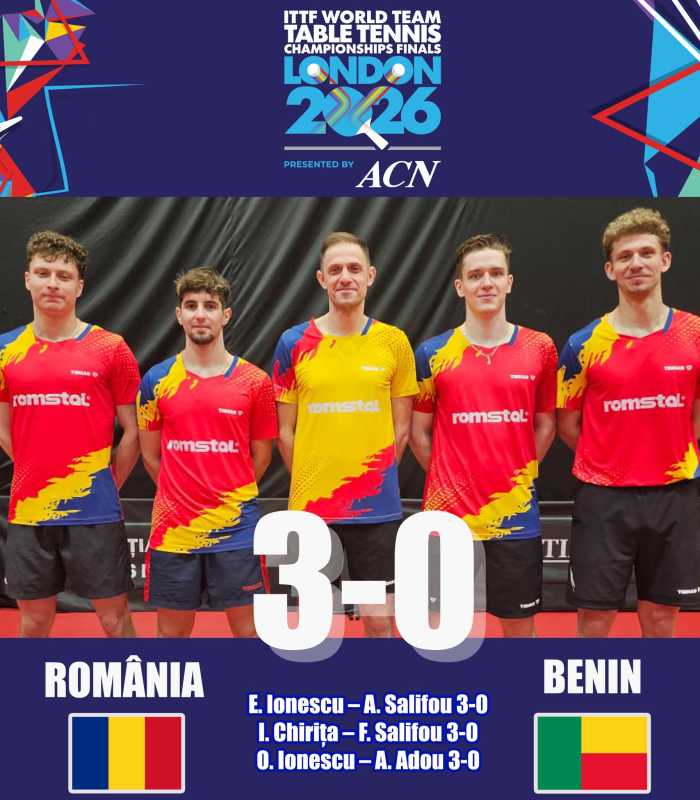 Selecționata masculină a României a învins formația Beninului cu scorul de 3-0, marți seara, în Grupa a 9-a a preliminariilor Campionatelor Mondiale de tenis de masă de la Londra. Punctele tricolorilor au fost obținute de Eduard Ionescu, care a trecut de Abdel Salifou cu 3-0 (11-9, 11-4, 11-6), de Iulian Chirița, victorios &i