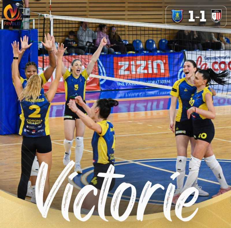 Semifinalele Diviziei A1 la volei feminin consemnează egalitatea după primele două meciuri, în urma victoriilor reușite, joi, de CSM Corona Brașov și CS Dinamo București. CSM Corona Brașov a învins campioana CSM Volei Alba-Blaj cu scorul de 3-2 (25-16, 25-21, 18-25, 20-25, 15-13), în Sala Polivalentă ''Dumitru Popescu