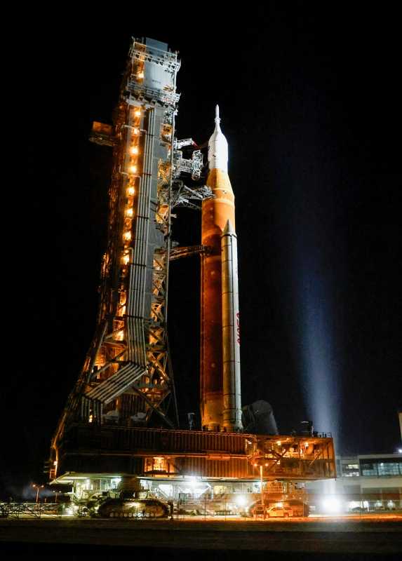SLS și capsula Orion au ajuns pe platformă la ora 15:21 GMT. În aceeași dimineață, la ora 04:20 GMT, SLS, Orion și platforma lor mobilă de lansare (MLP) au fost fixate pe un vehicul de transport pe șenile al NASA pentru o călătorie de 6,4 kilometri până la instalația de lansare.