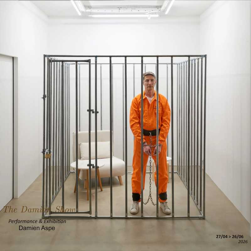 Artistul francez contemporan Damien Aspe, îmbrăcat într-un costum portocaliu, intenționează să rămână timp închis de o lună într-o cușcă metalică, în vitrina galeriei sale din Toulouse, în sud-vestul Franței, pentru a denunța influența rețelelor sociale și a tehnologiei digitale, care îi ține astăzi 'prizonieri' pe cetă