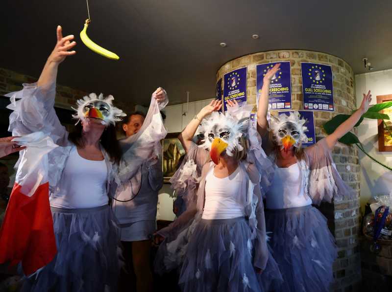 Concursul, care se desfășoară într-un pub local, a atras participanți de toate vârstele, inclusiv familii cu copii, unii dintre ei îmbrăcați în costume de pescăruși. Fiecare concurent a fost întâmpinat cu ovații de spectatori.
