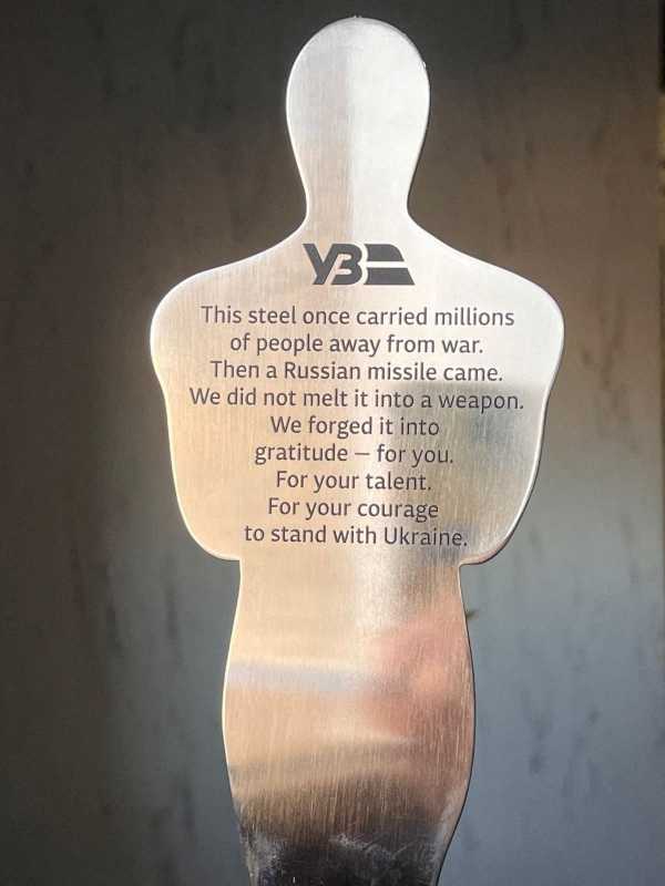 Actorul american Sean Penn, care a efectuat o vizită în Ucraina și a lipsit duminică de la ceremonia de decernare a premiilor Academiei Americane de Film, în cadrul căreia a fost recompensat cu al treilea Oscar din carieră, a primit marți un trofeu asemănător din partea ucrainenilor, realizat din oțel provenit de la un vagon avariat într-un atac rus